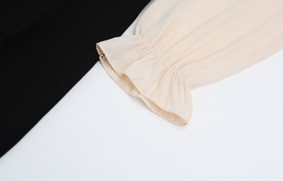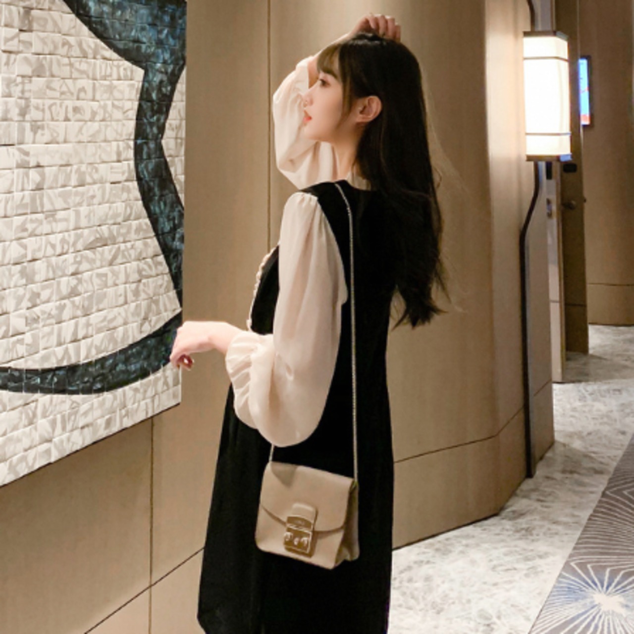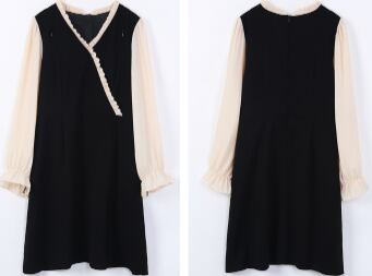 マタニティ ワンピース 長袖 春 秋 授乳口付き 黒 モノトーン ミニ丈 可愛い ガーリー Vネック Iライン 無地 フリル シフォン 異素材 切り替え 妊婦服 授乳服 マタニティウェア