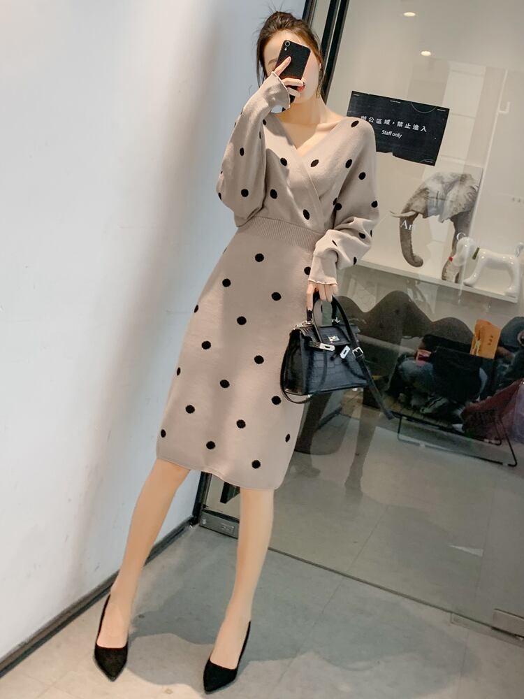 マタニティ ワンピース ニット 春 秋 カシュクール Vネック ドット ベージュ ひざ丈 長袖 Iライン カジュアル 大人可愛い ニットワンピ 妊婦服 授乳服 マタニティウェア