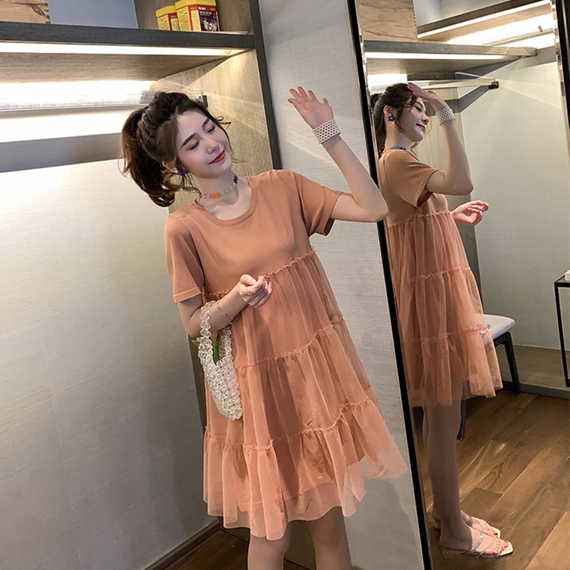 マタニティ ワンピース 2020年 新作 春 夏 チュール ティアード 大きいサイズ オレンジ グリーン ひざ丈 カジュアル 可愛い ガーリー 無地 妊婦服 マタニティウェア