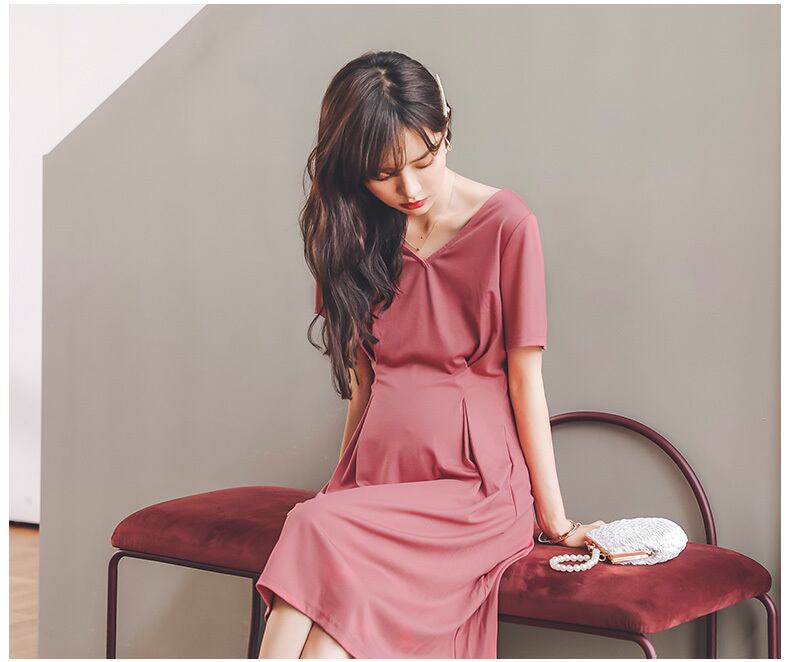 マタニティ ワンピース ひざ丈 夏 春 ブラック ピンク グリーン シンプル バックコンシャス 半袖 Vネック 無地 おしゃれ カジュアル きれいめ 妊婦服 マタニティウェア
