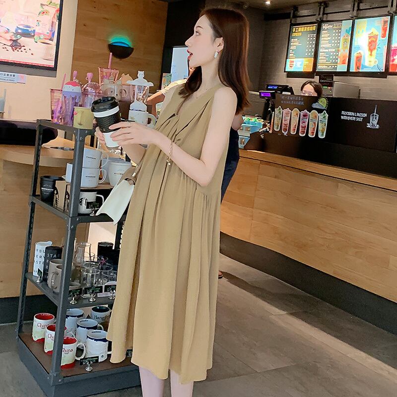 マタニティ ワンピース ロング丈 夏 春 襟付き 大きいサイズ ノースリーブ 袖なし カーキ Aライン 無地 きれいめ 大人 シンプル 上品 Vネック 妊婦服 マタニティウェア