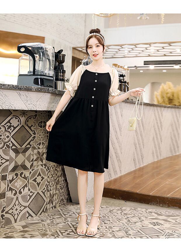 マタニティ ワンピース 半袖 ひざ丈 モノトーン ブラック パフスリーブ 大きいサイズ 夏 春 きれいめ 可愛い フェミニン 切り替え 異素材 ラウンドネック 無地 大人 シンプル 妊婦服 マタニティウェア