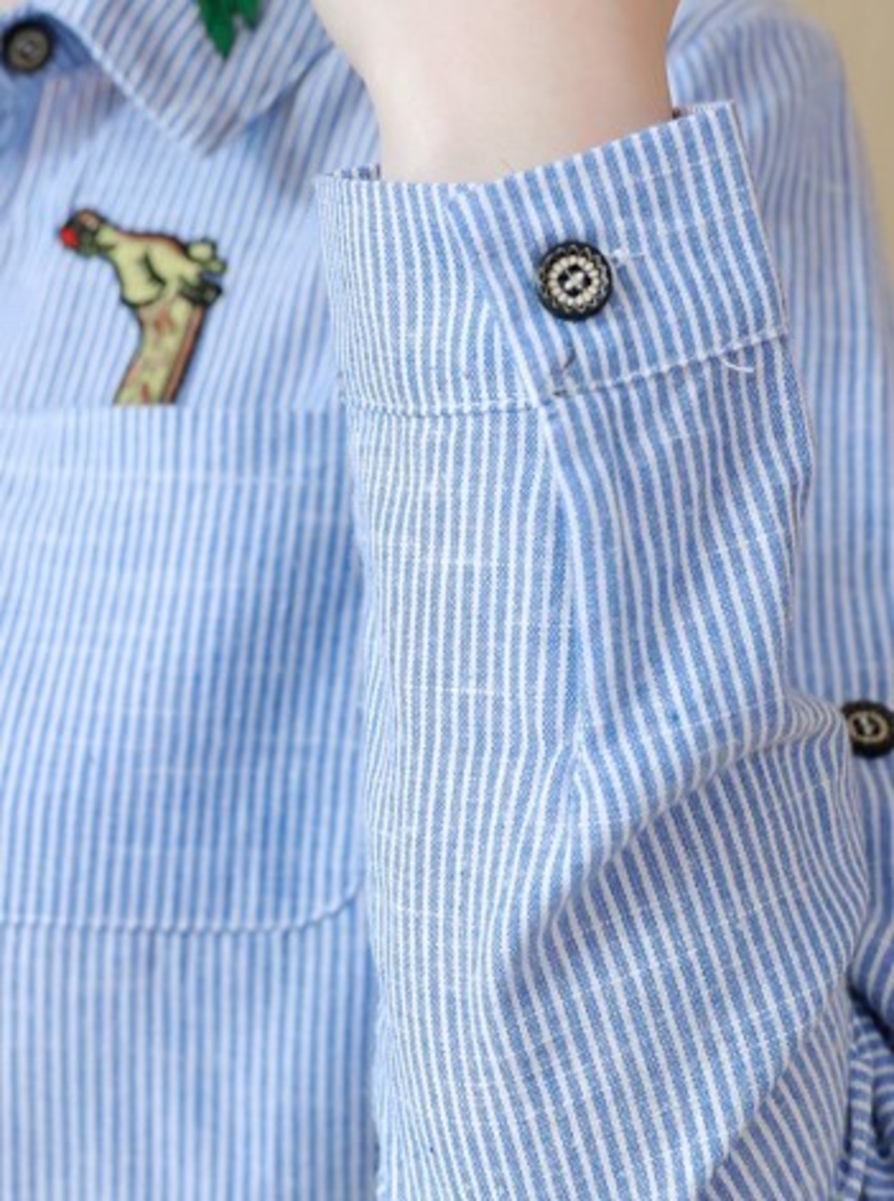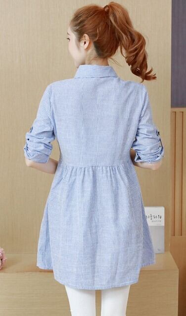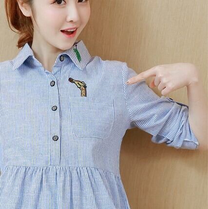 マタニティ ワンピース ミニ丈 春 秋 夏 キリン 刺繍 ワッペン ブルー ストライプ 襟付き 長袖 大きいサイズ 2020年 新作 ポケット 可愛い フェミニン 前開き 妊婦服 授乳服 マタニティウェア