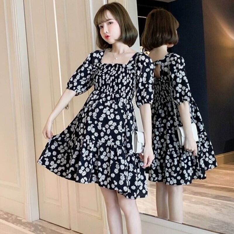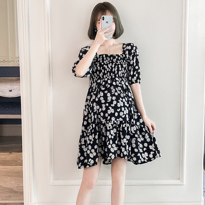 マタニティ ワンピース 花柄 夏 春 ひざ丈 バックリボン スクエアネック ブラック 黒 Aライン 半袖 モノトーン 大人 上品 フェミニン 妊婦服 マタニティウェア