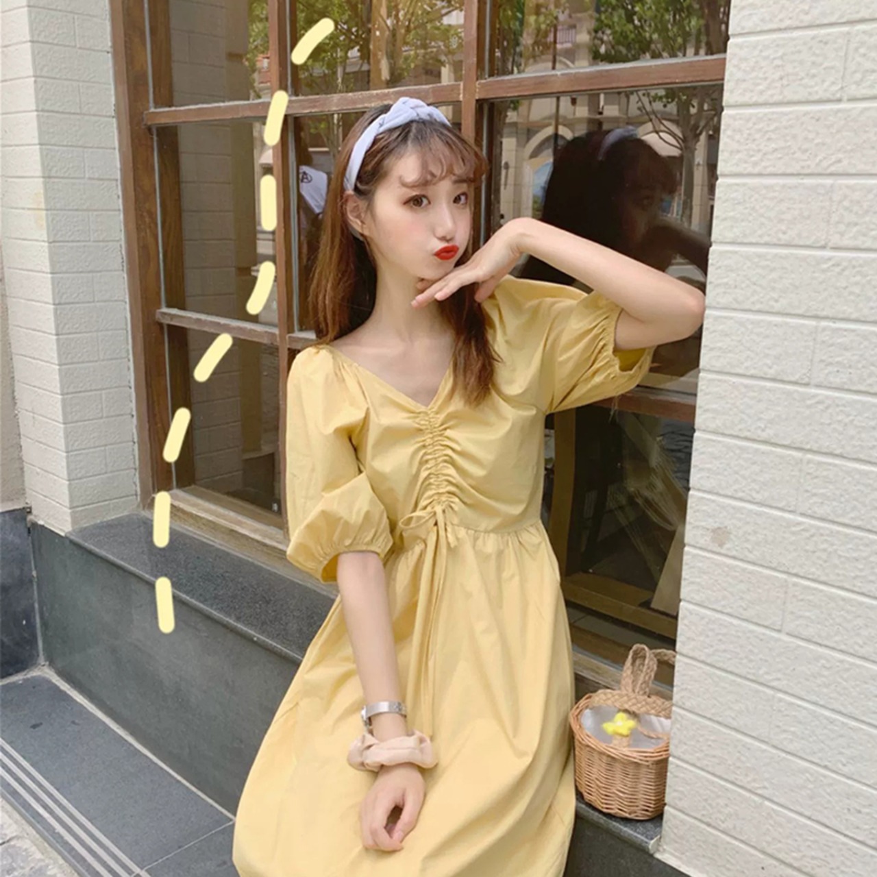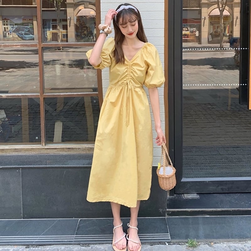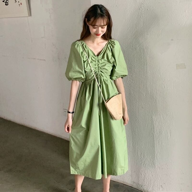 マタニティ ワンピース 半袖 夏 春 ロング丈 Vネック 2020年 新作 黄色 緑 イエロー グリーン パフスリーブ 無地 シンプル ゆったり大きいサイズ ハイウエスト 大人可愛い かわいい フェミニン ガーリー 妊婦服 マタニティウェア